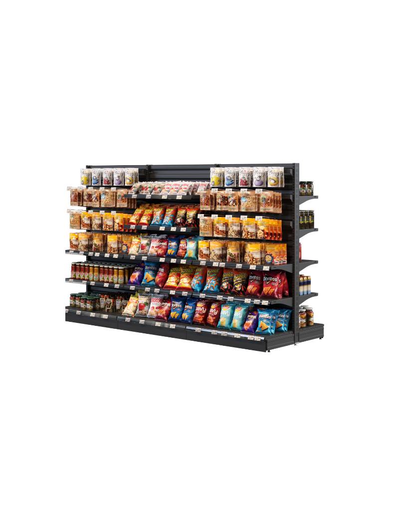 📐 Gain de place : Les gondoles centrales permettent une exposition bilatérale, maximisant l’utilisation de l’espace.
